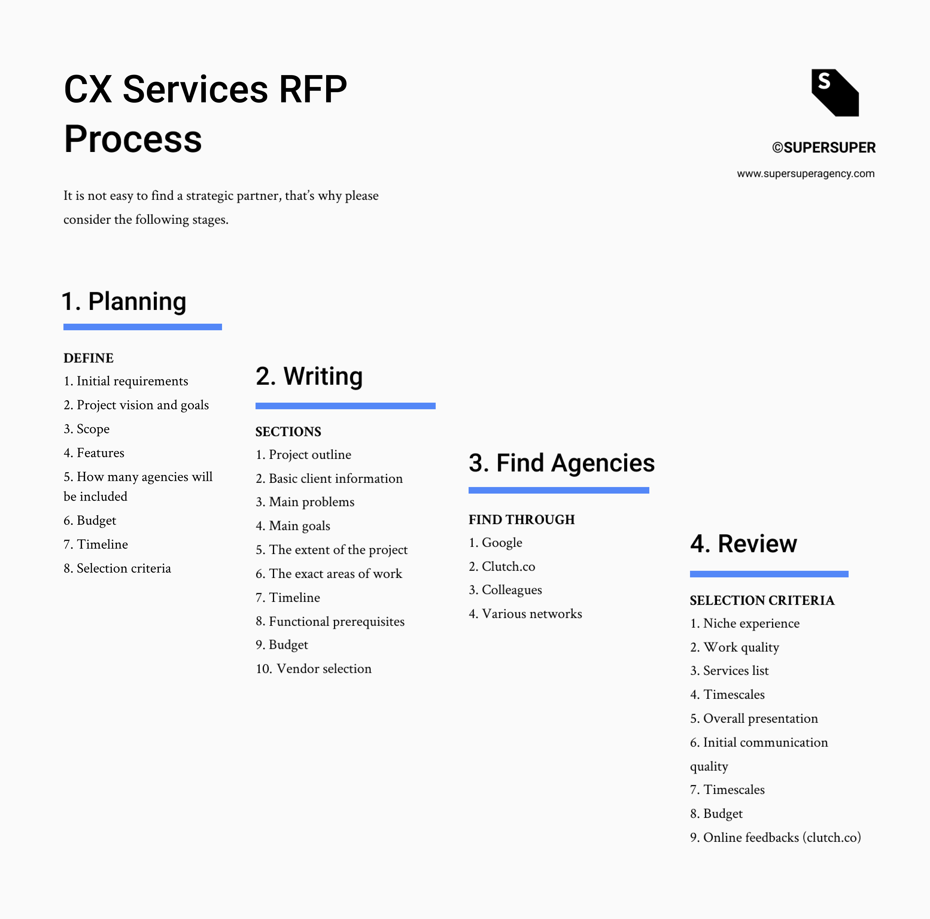 For the best results, RFP will be needed in most cases because it allows the most detailed comparison of the competing CX consultancies. You can also select a consultancy based on their website presentation or by word of mouth, but we recommend that you implement at least essential elements mentioned in this article.