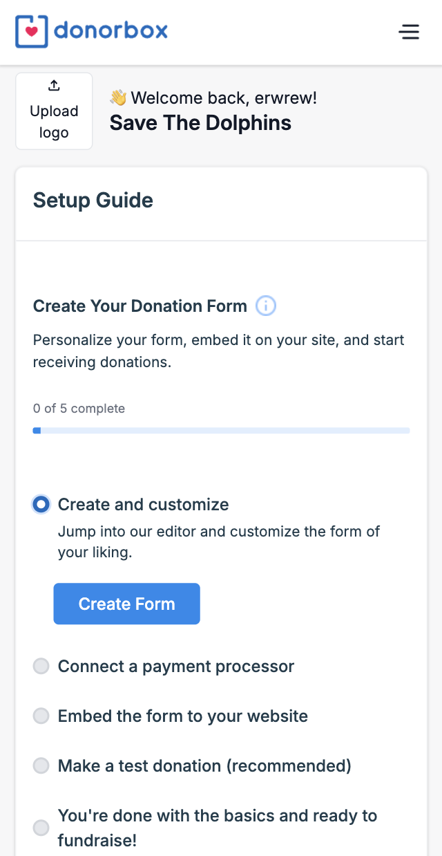 Designed the onboarding guide to be visually integrated into the existing Donorbox homepage. The guide includes clear calls-to-action and visual hierarchy, allowing users to understand the critical steps required to successfully onboard.