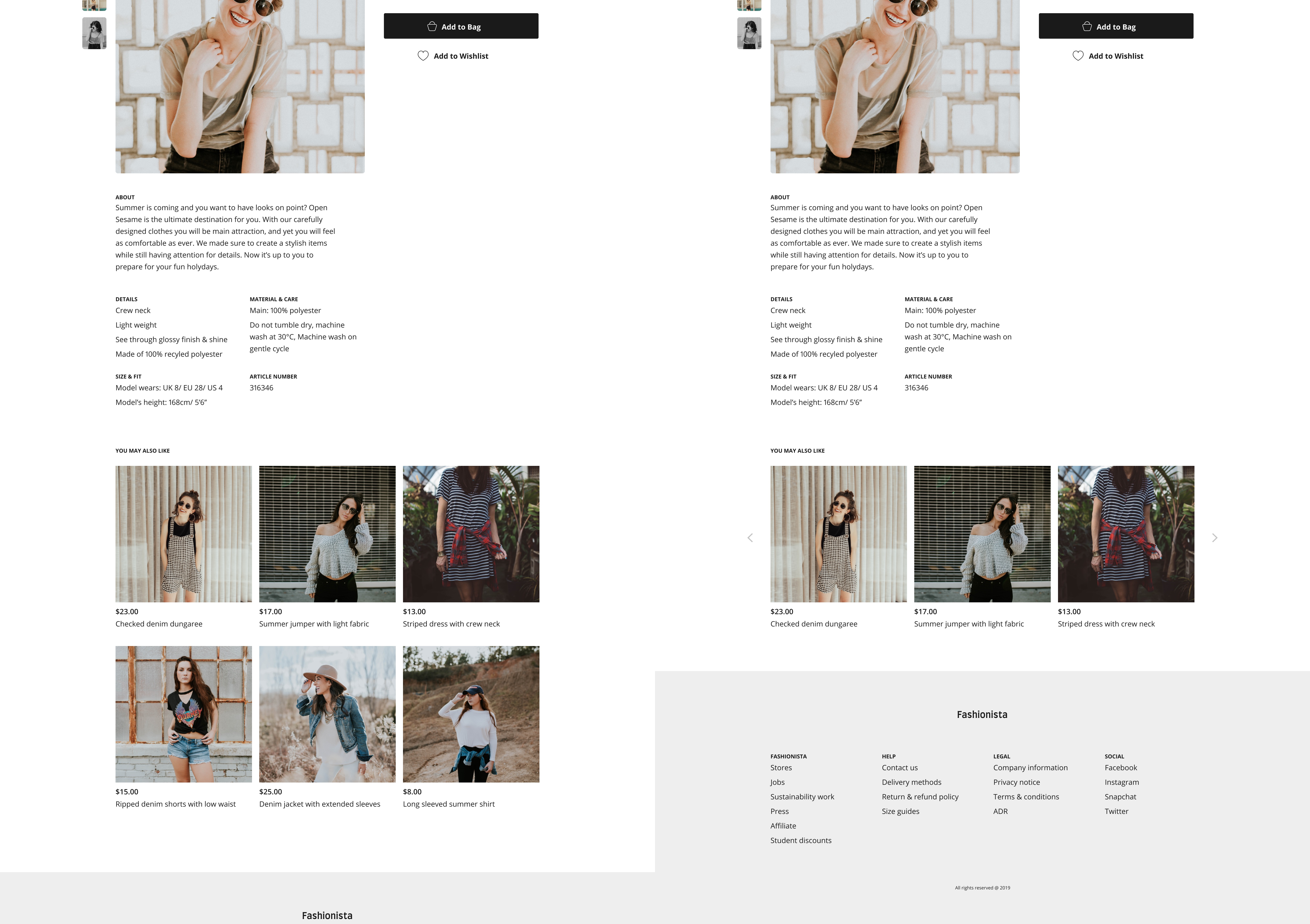 The amount of information accompanying a product tends to vary, naturally. The first thing to decide is whether products are on the information-heavy side, or if they are visually heavy. Some simple examples are fashion eCommerce sites, where users get the most information from images and some details from the description. Another example is an open marketplace platform for eCommerce such as Amazon, which has a variety of products available where in some instances user's priorities are detailed information rather than images.