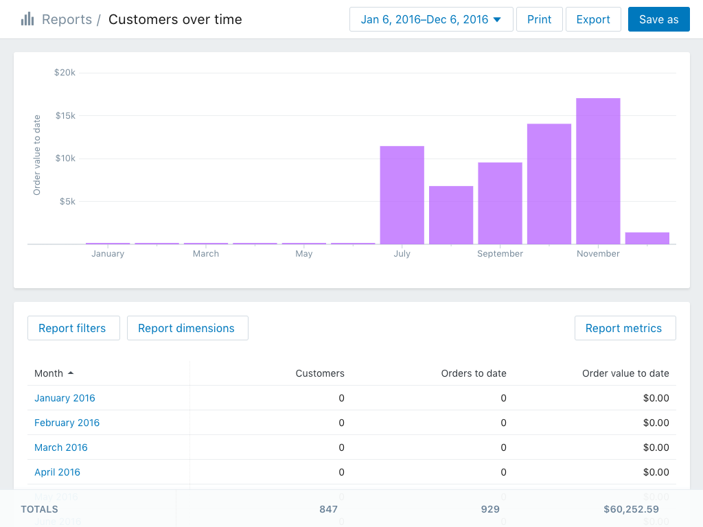 Shopify: Shopify has comprehensive analytics integrated into it. It provides detailed statistics in its reports, that are: